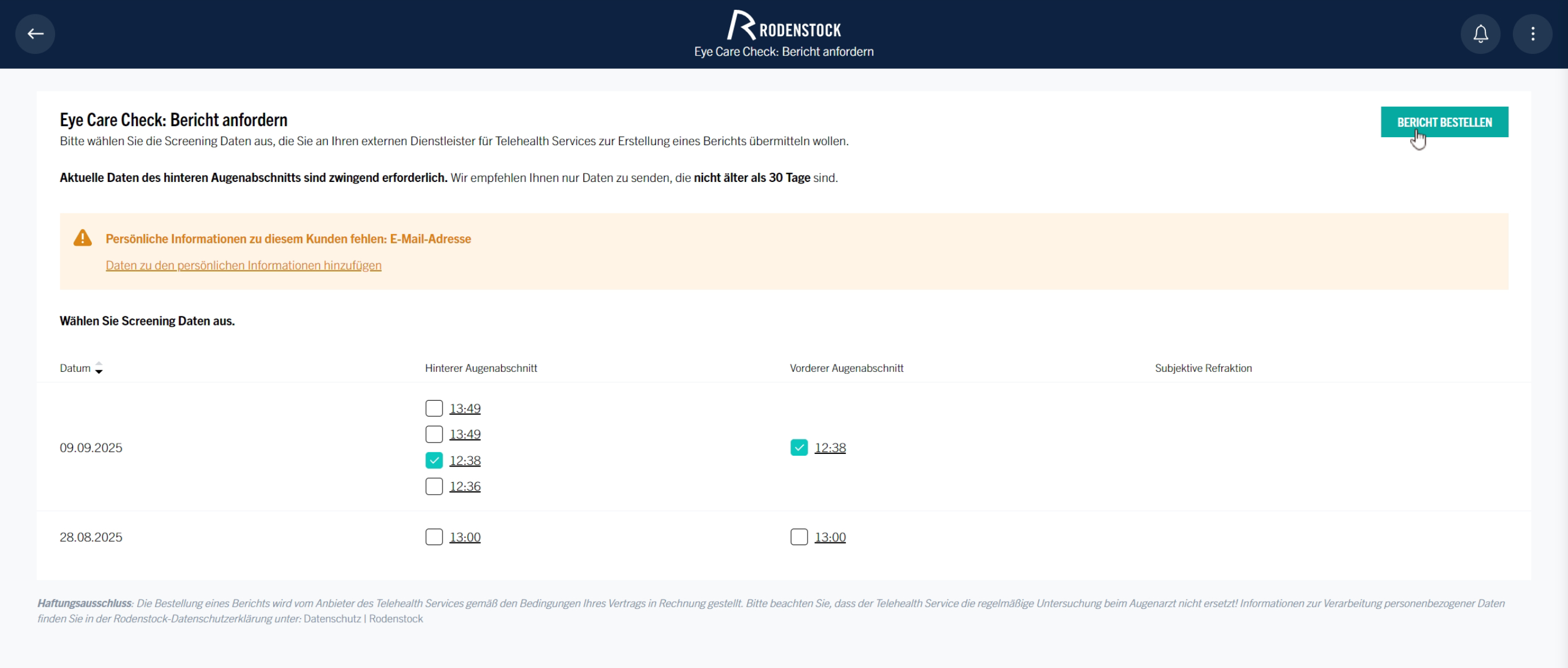- Löschen Sie die bestehende Eye Care Check Anfrage. (Keine Sorge: Bereits an epitop übermittelte Daten oder eingetragene Anamnesewerte bleiben erhalten.)